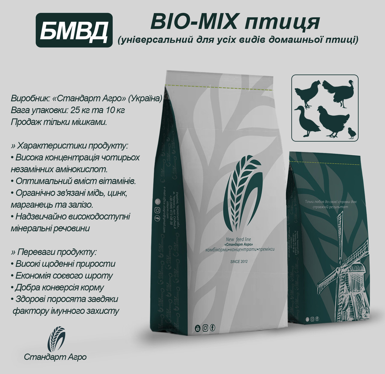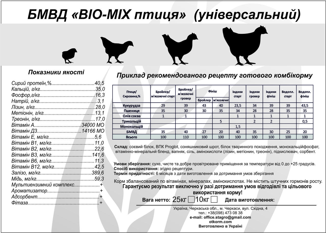 Білково-вітамінно-мінеральна добавка (БВМД) для птиці — це збалансований комплекс поживних речовин, призначений для приготування повнораціонного комбікорму. Забезпечує швидкий ріст, правильний розвиток та високу продуктивність птиці.